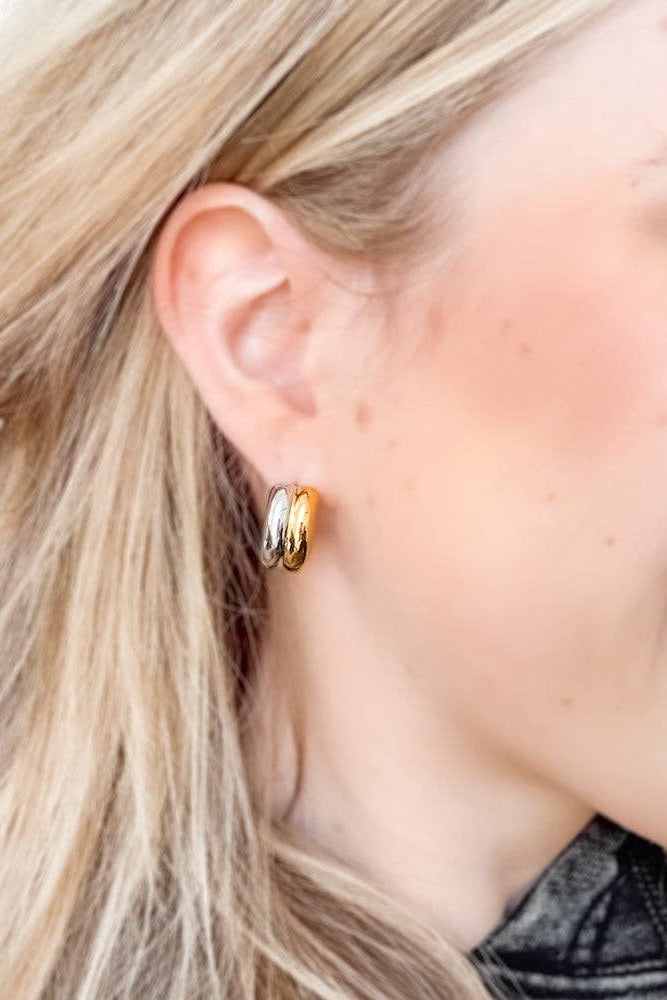 Add some fun and flair to your earring game with our Charity Side by Side Hoops! These chunky small hoops feature a two tone gold and silver design, perfect for mixing and matching with your favorite studs or huggie style earrings. Stack 'em up for a playful and stylish look!