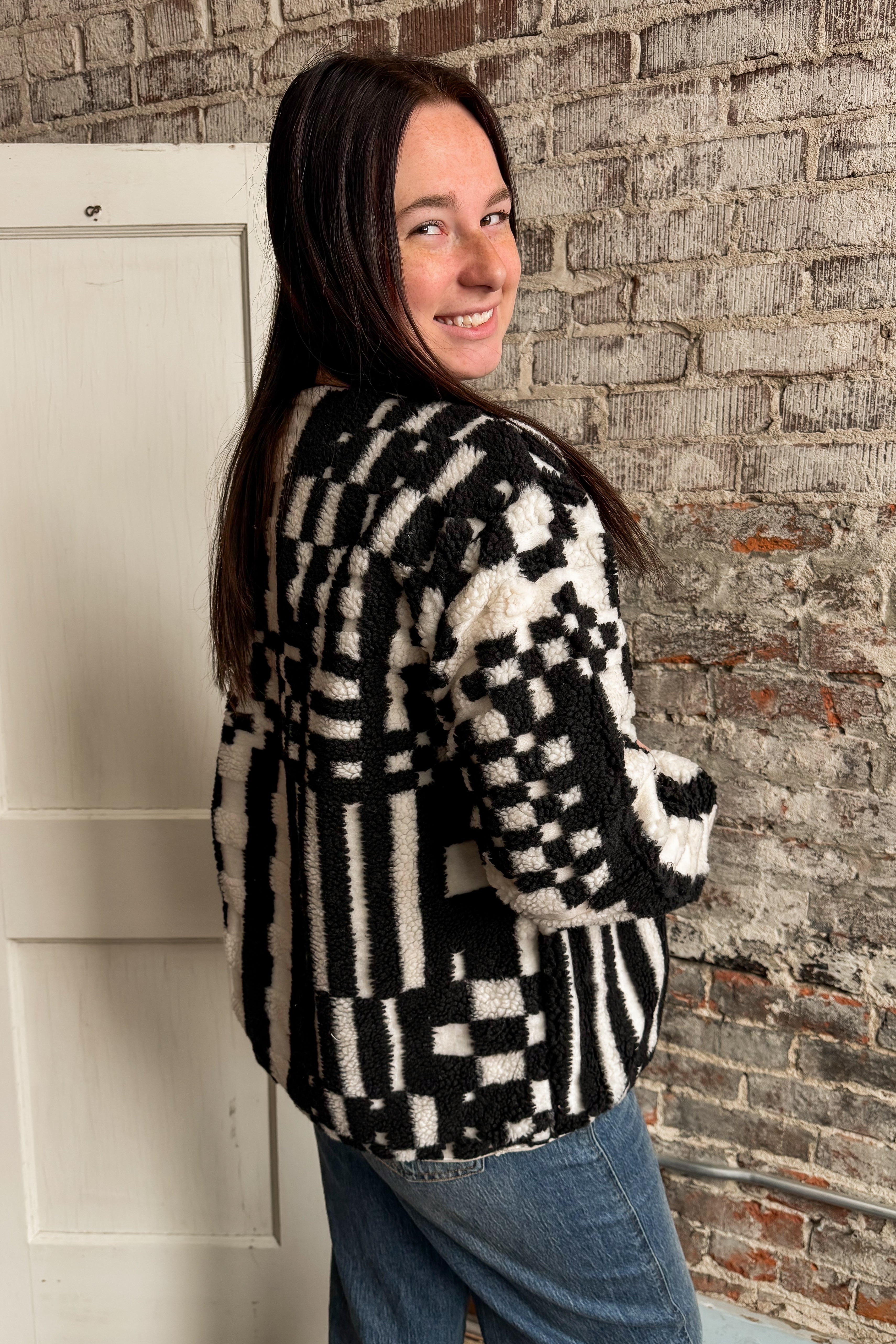 We love the abstract checkered design on this button down fleece! Thick enough to wear as a jacket but definitely great for those of us who are always wearing cardigans.