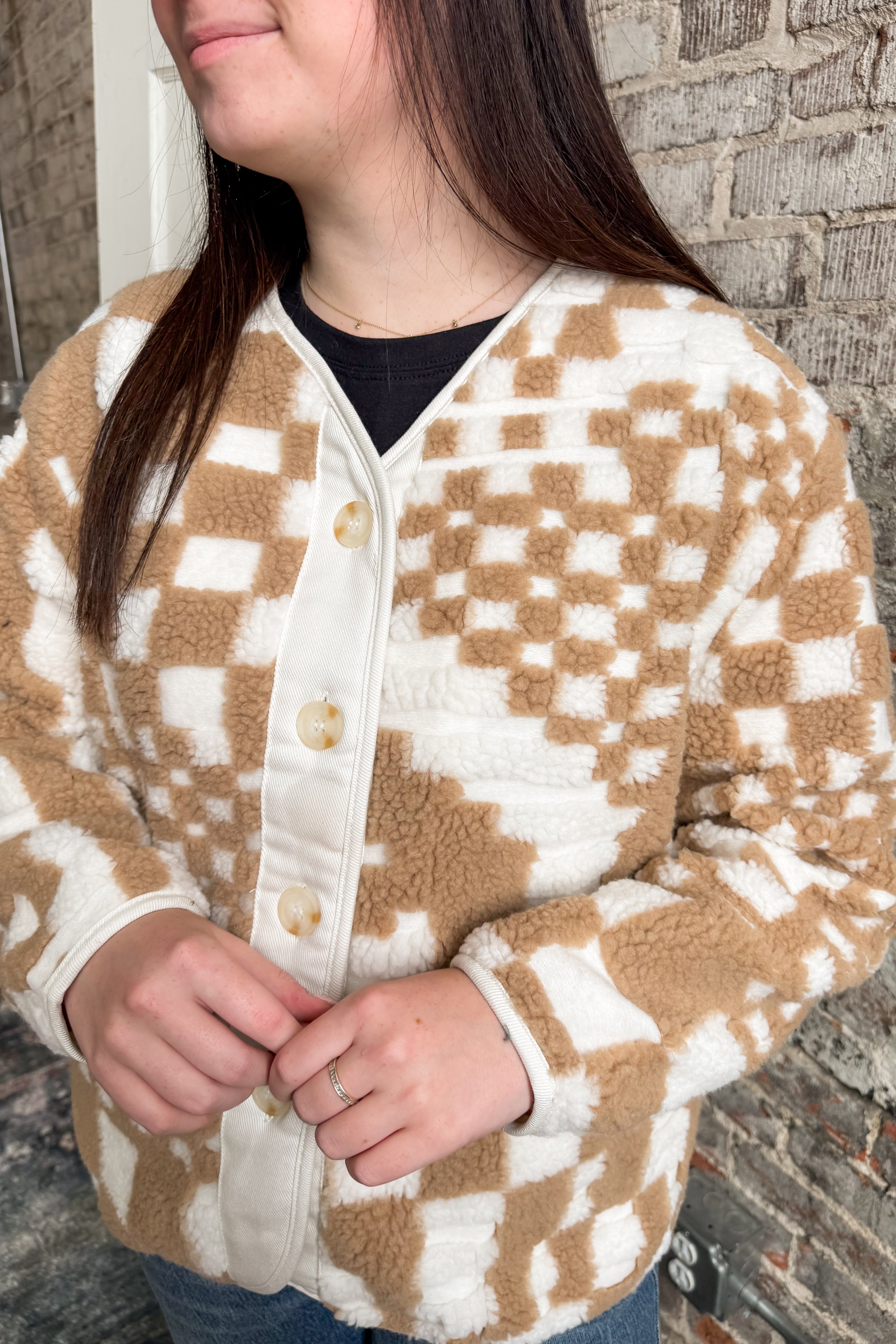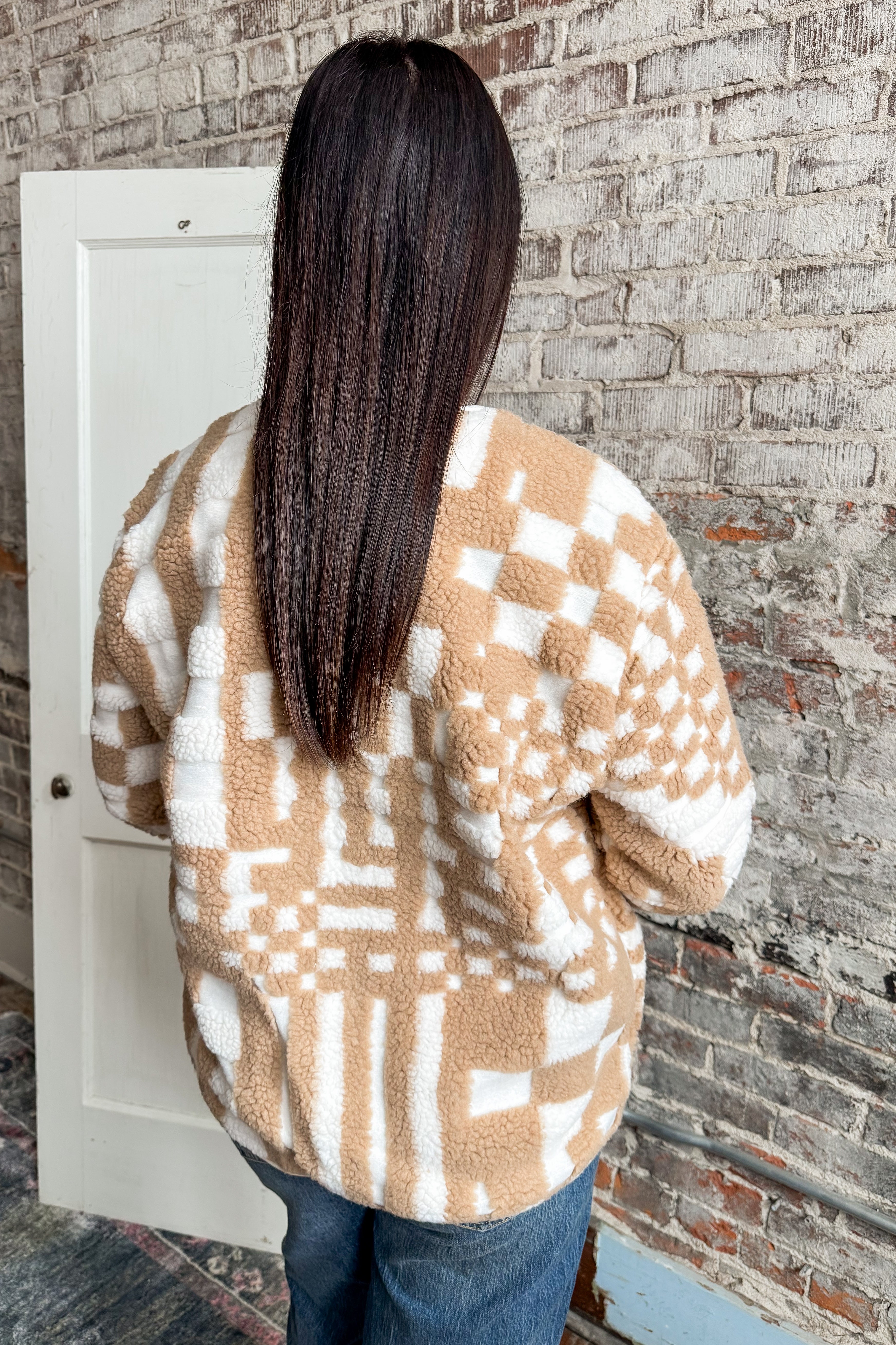 Taupe Checkered V-Neck Button Down Fleece Jacket