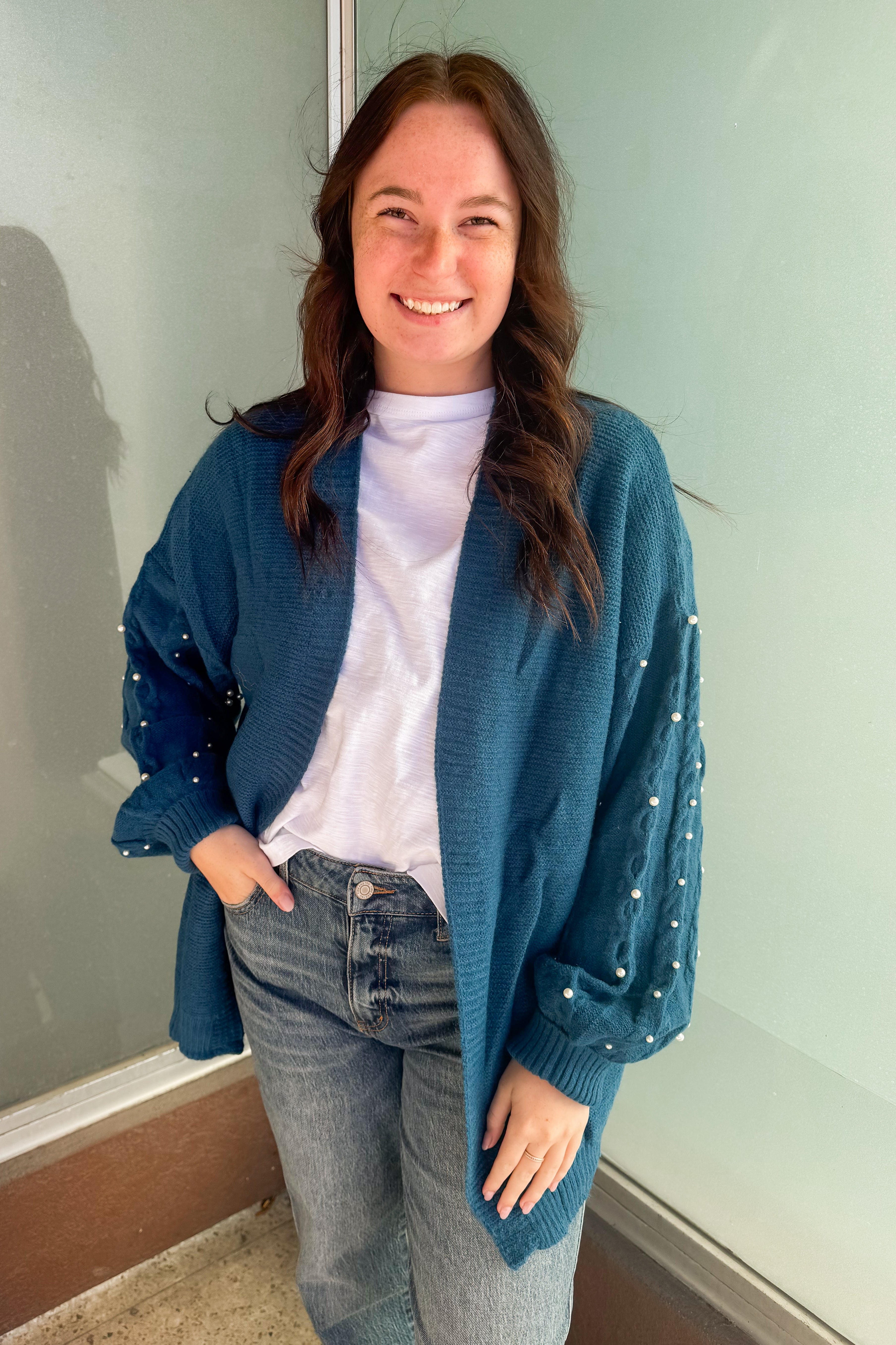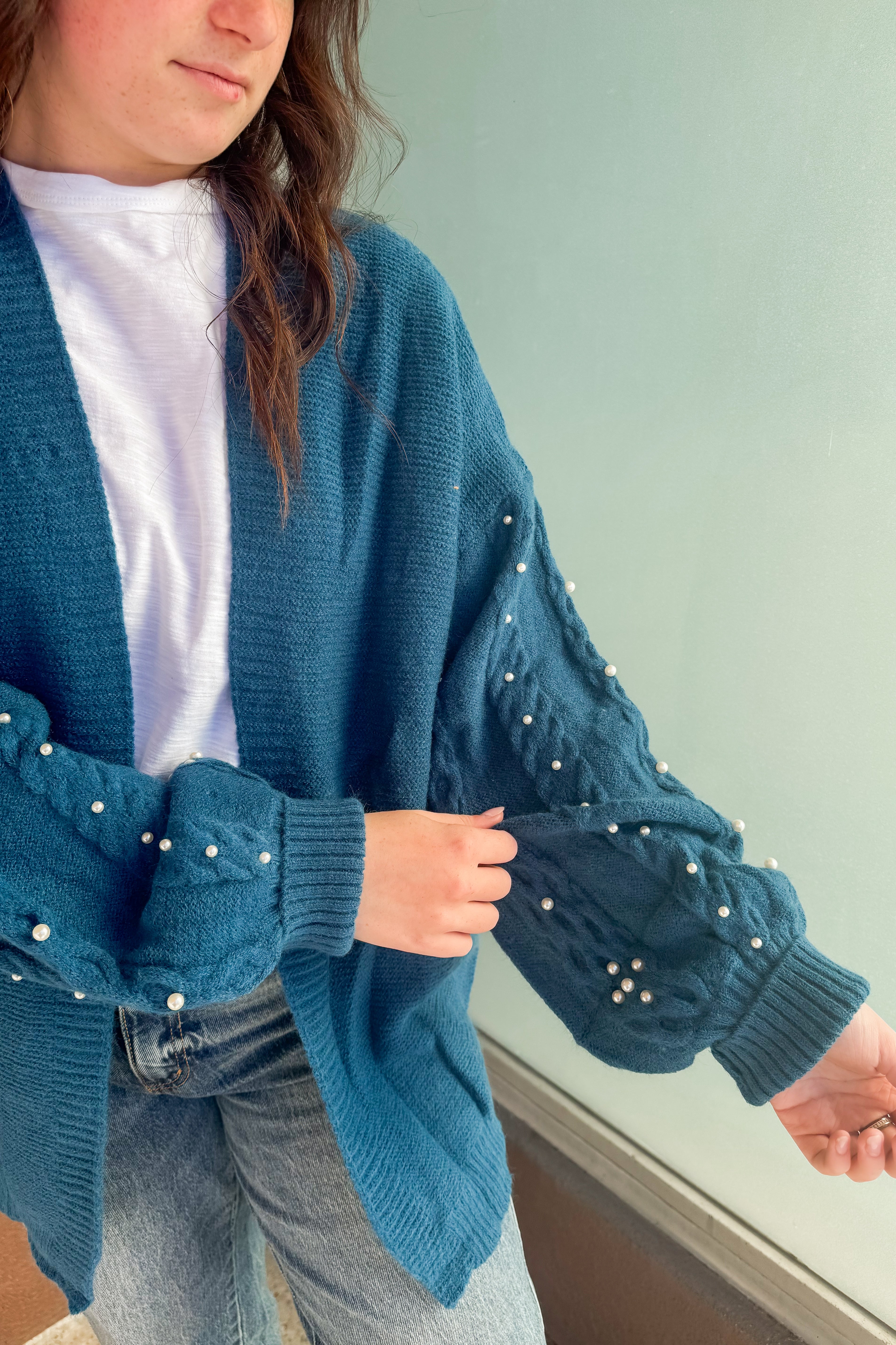 The pearl sleeve detail gives sophistication and class making this cardigan extremely unique.