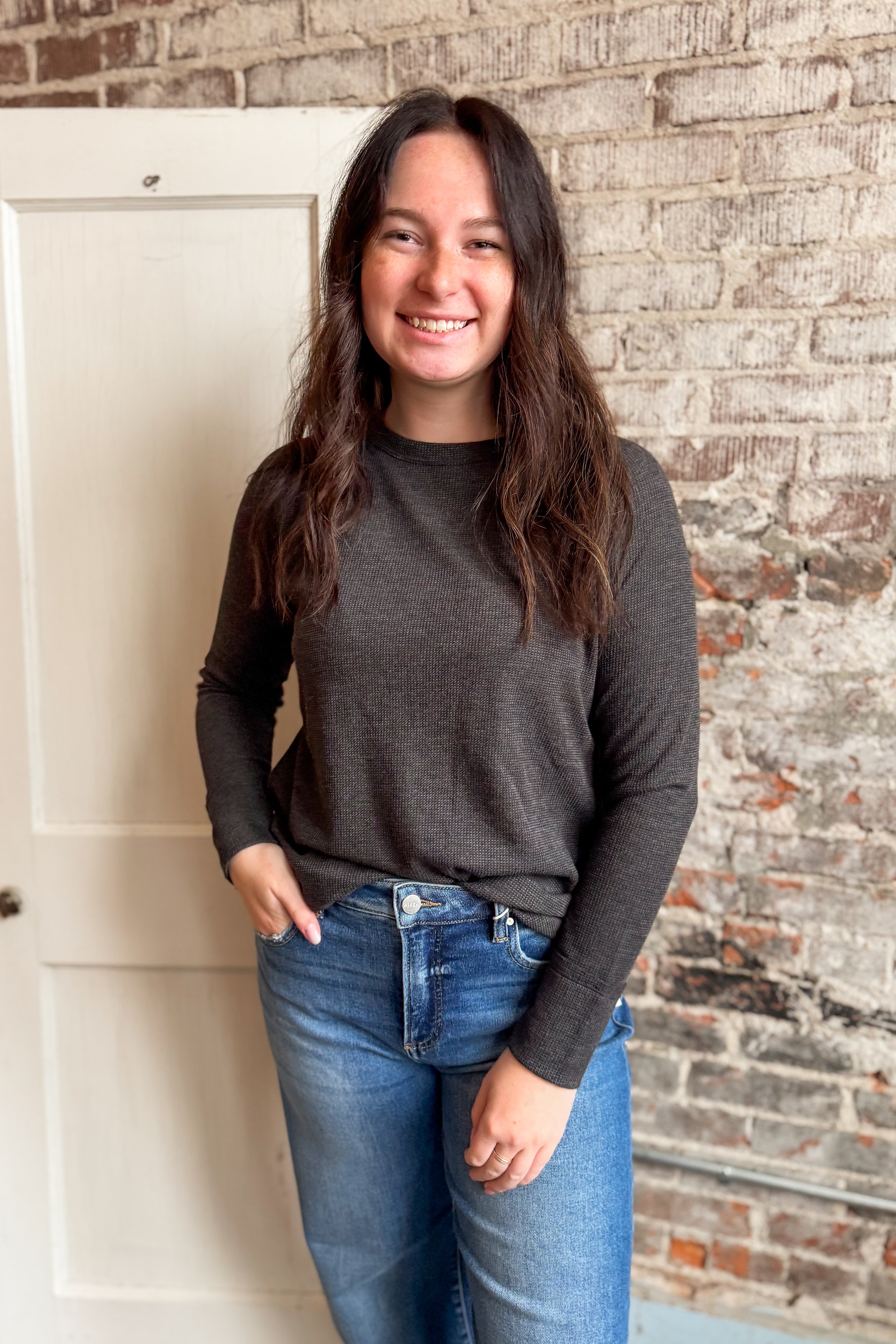 This long sleeve waffle knit top is a staple that will serve you well as you pair multiple pieces with it to create several looks. It can be accessorized alone, paired with a vest, or worn as an extra layer for added warmth.