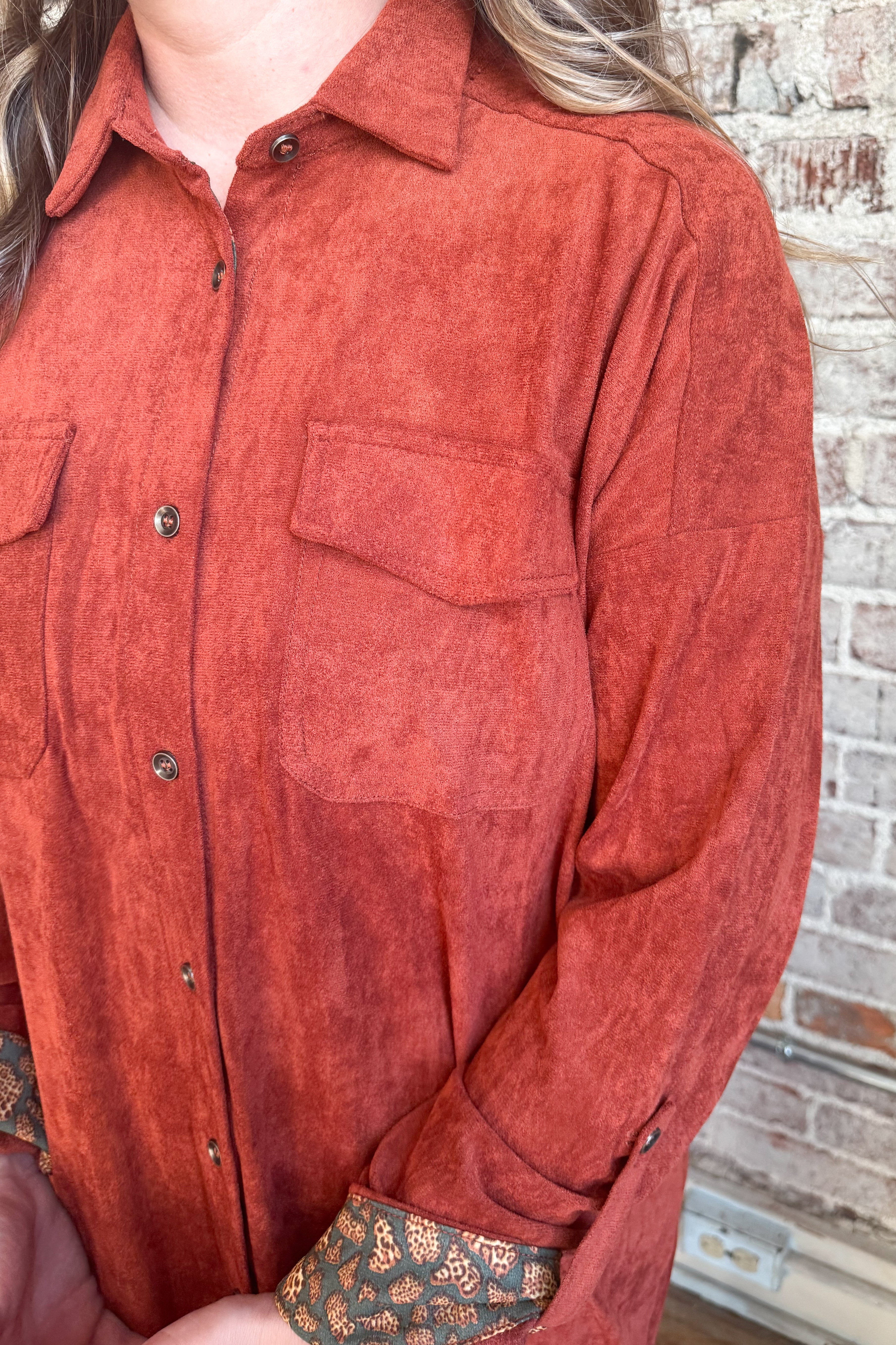 Features: Fold-over collar, button front closure, double chest pockets, long sleeves, side slits, hidden contrast print detail