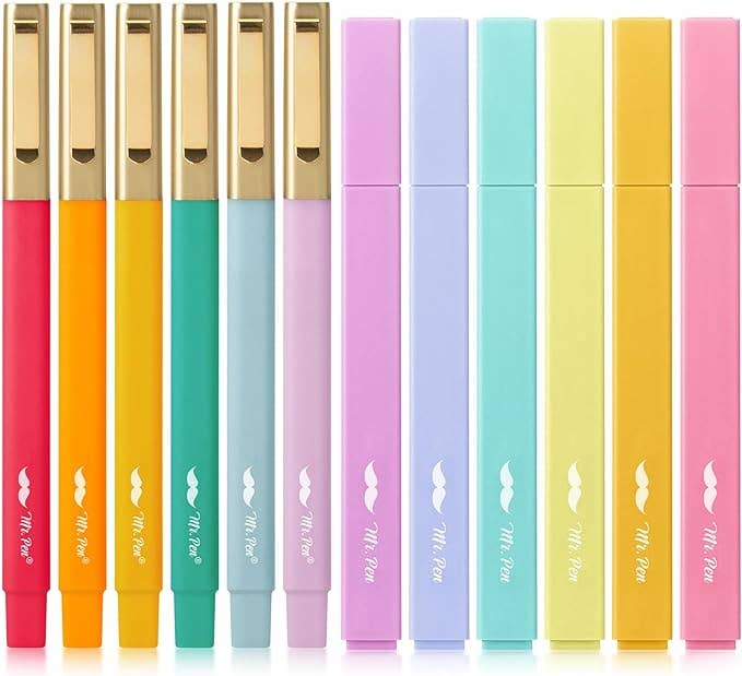 This set of Mr.Pen writing utensils includes 6 highlighters in a delightful assortment of non-neon, soft, and beautiful colors and 6 assorted color ballpoint pens with black ink.