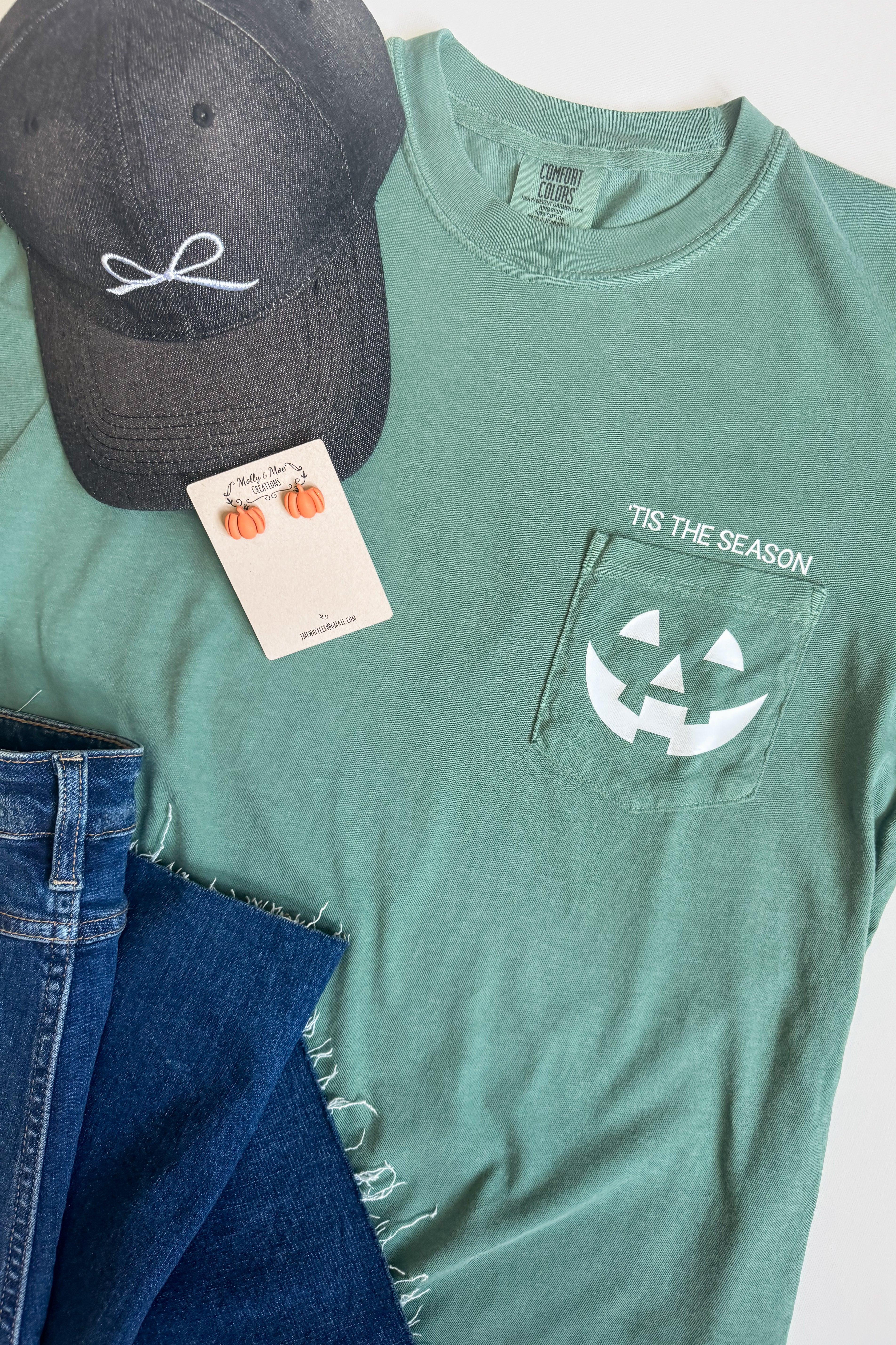 'Tis the season for all things fall! This cute pocket tee features a fun little jack 'o lantern on the pocket. Perfect for adding a little touch of fall to your closet.