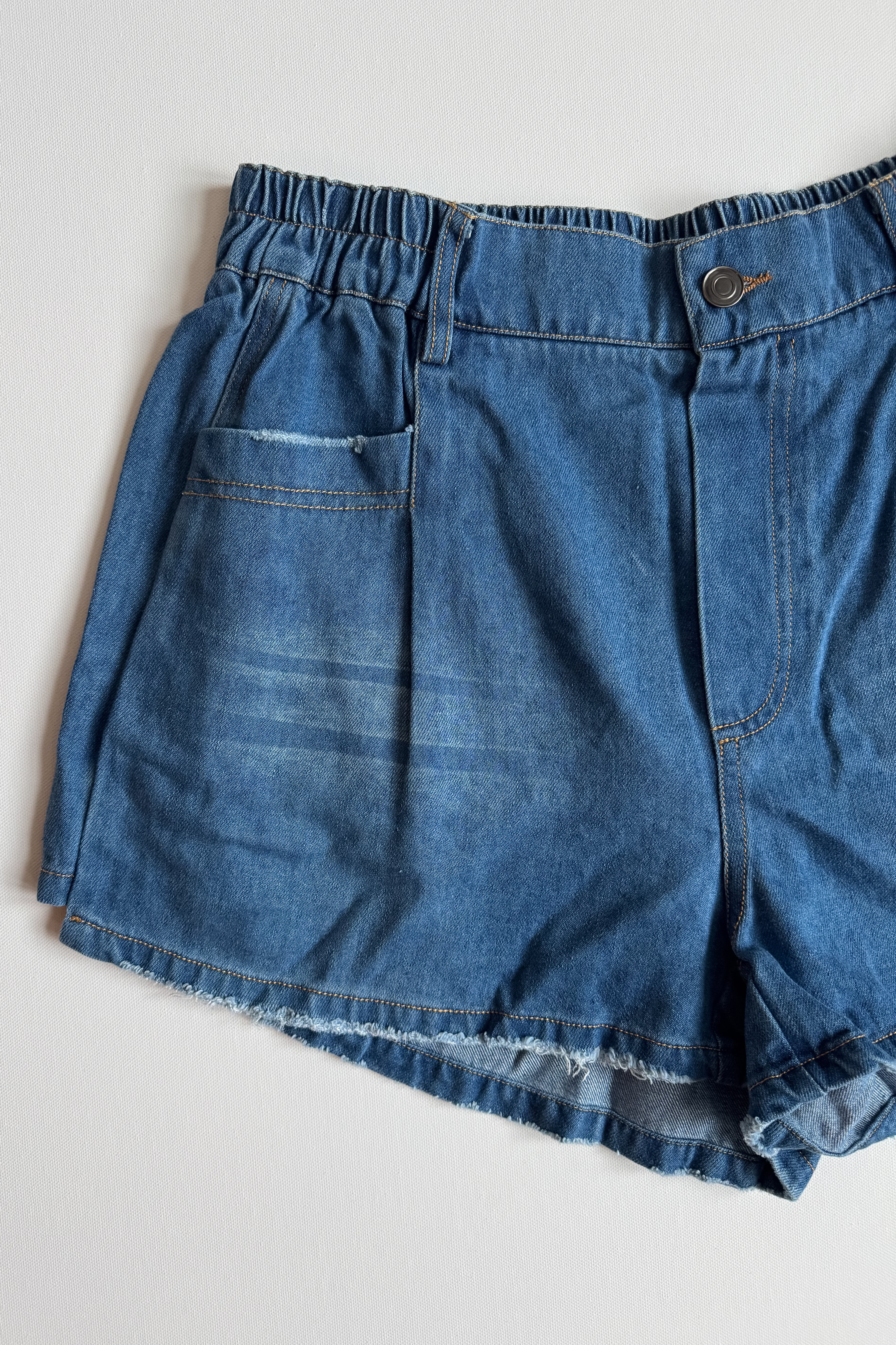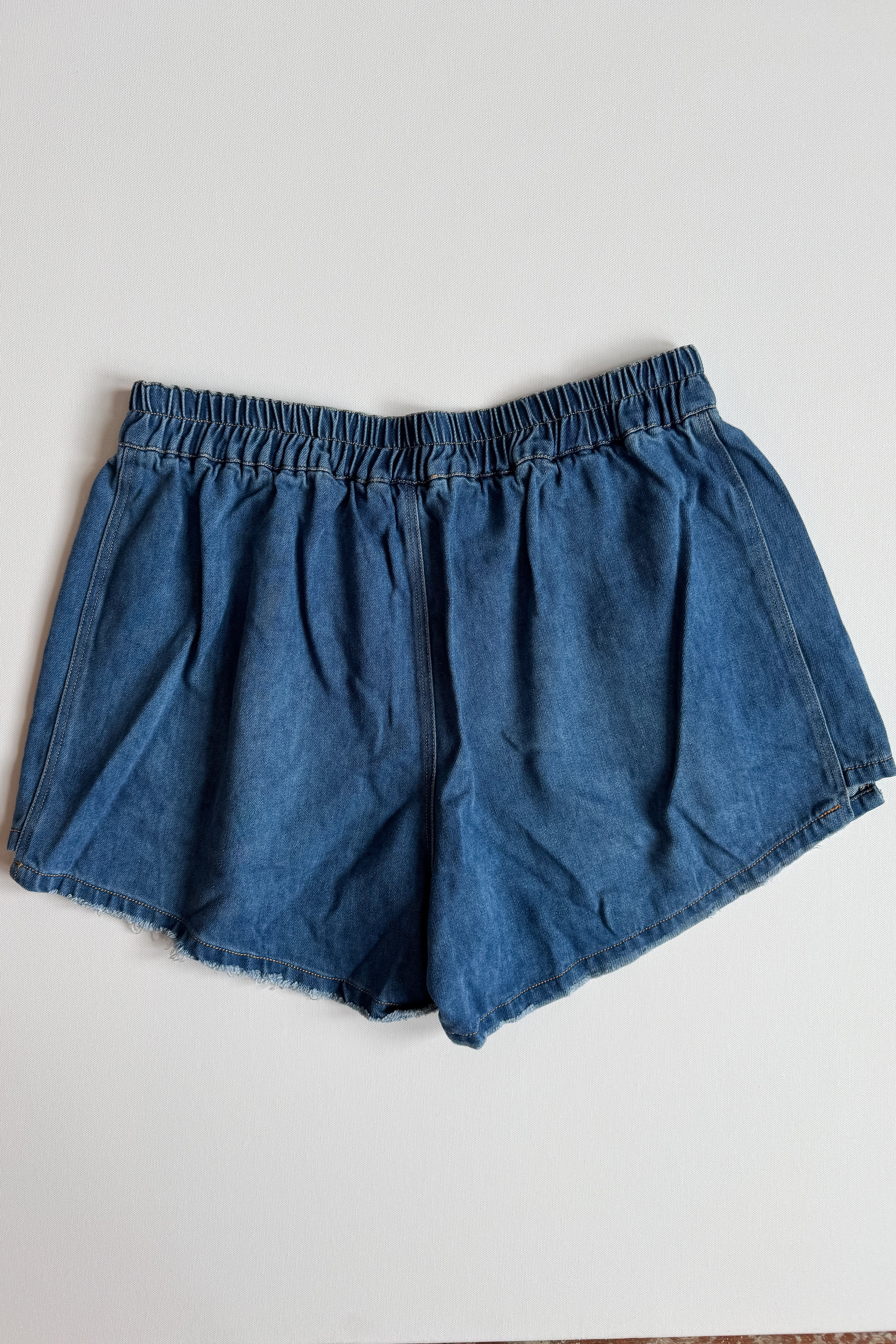 These pull on shorts have the cutest detail and are truly so trendy. They are soft and light weight. The back waistband is elasticized, but the front waist band is solid denim. Tuck in your shirts and show off the cute detail for a styled look.