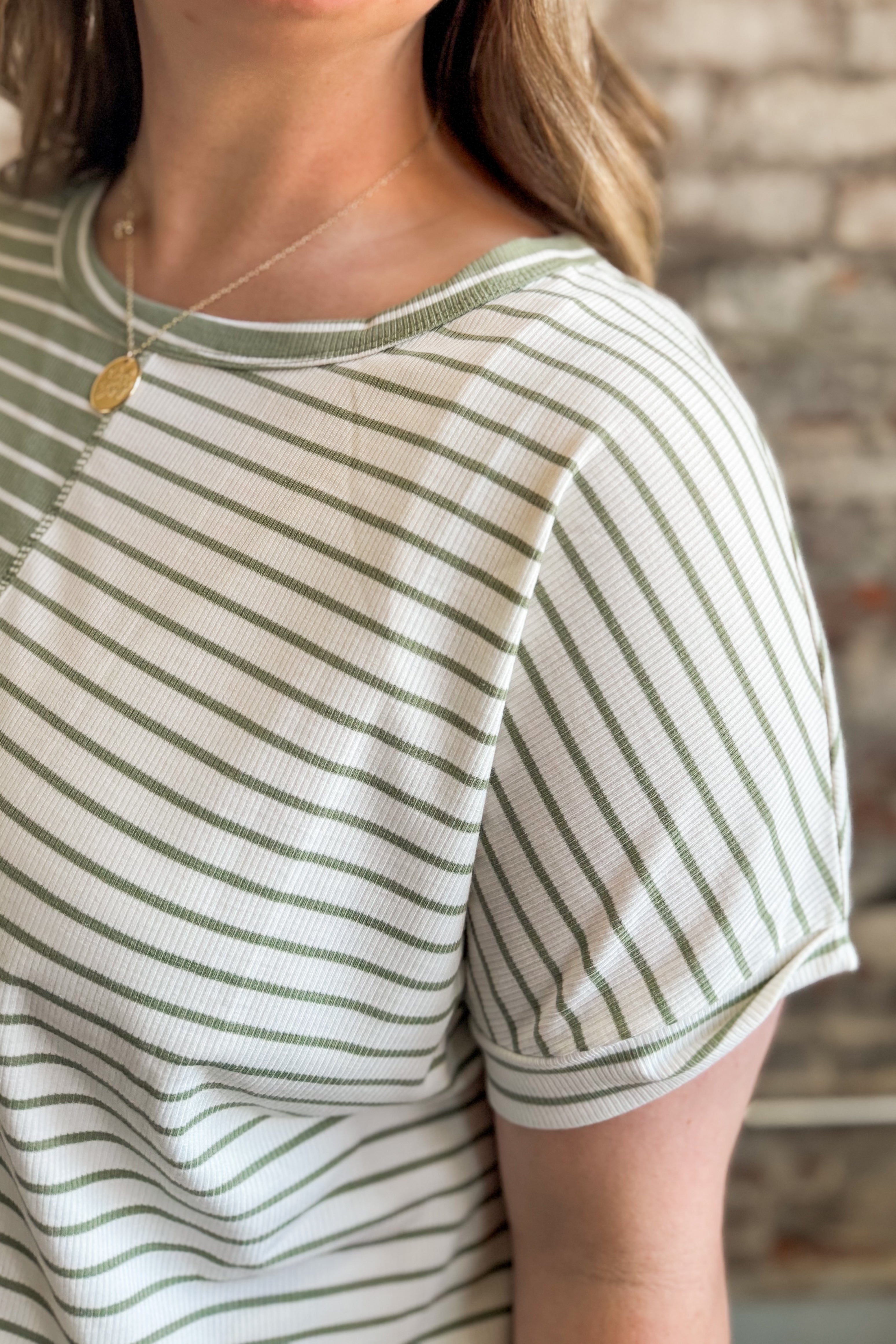 Features: Soft ribbed texture, raw hem center seam with contrasting white and sage stripes, round neckline, kimono short sleeve.
