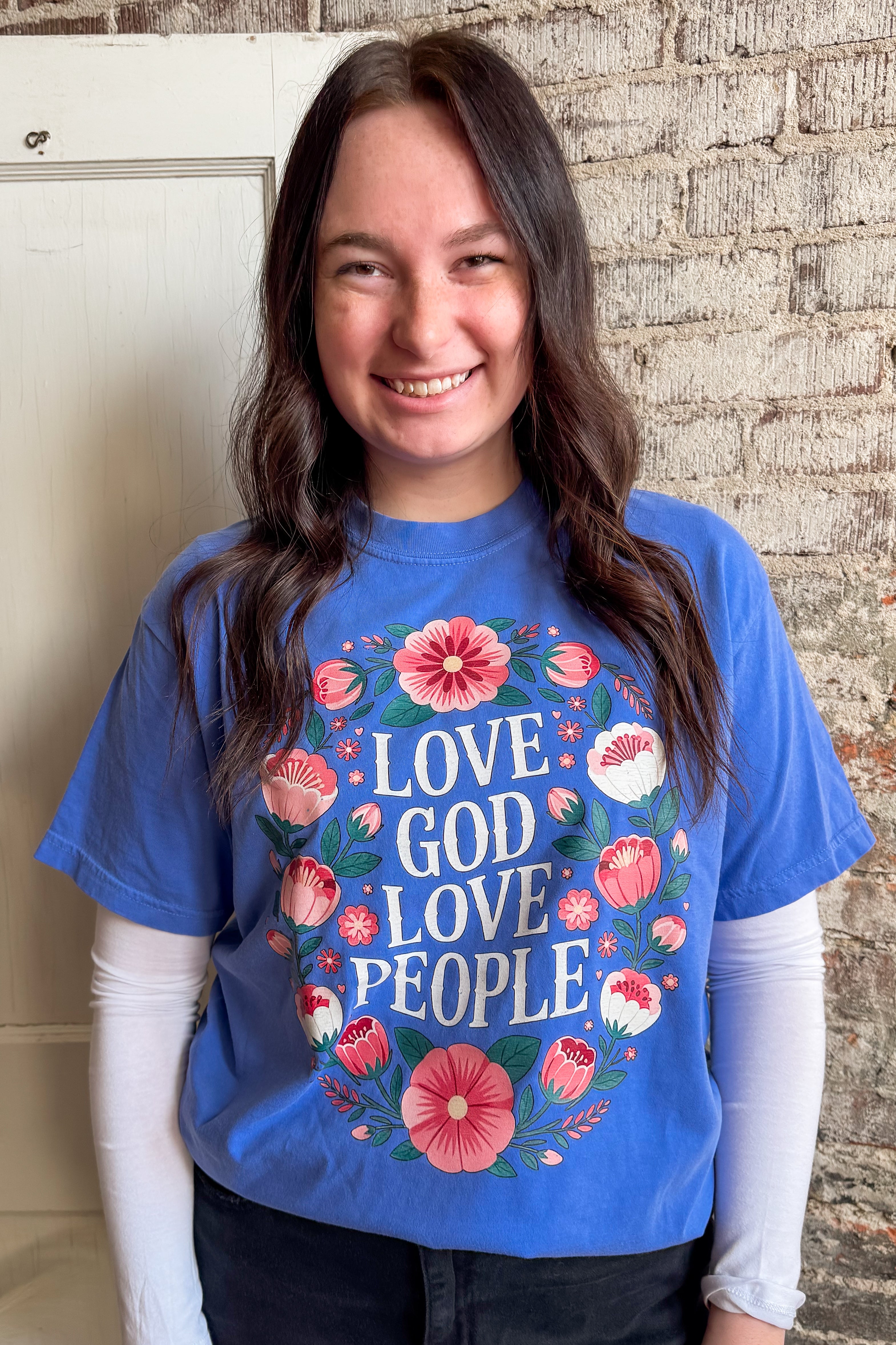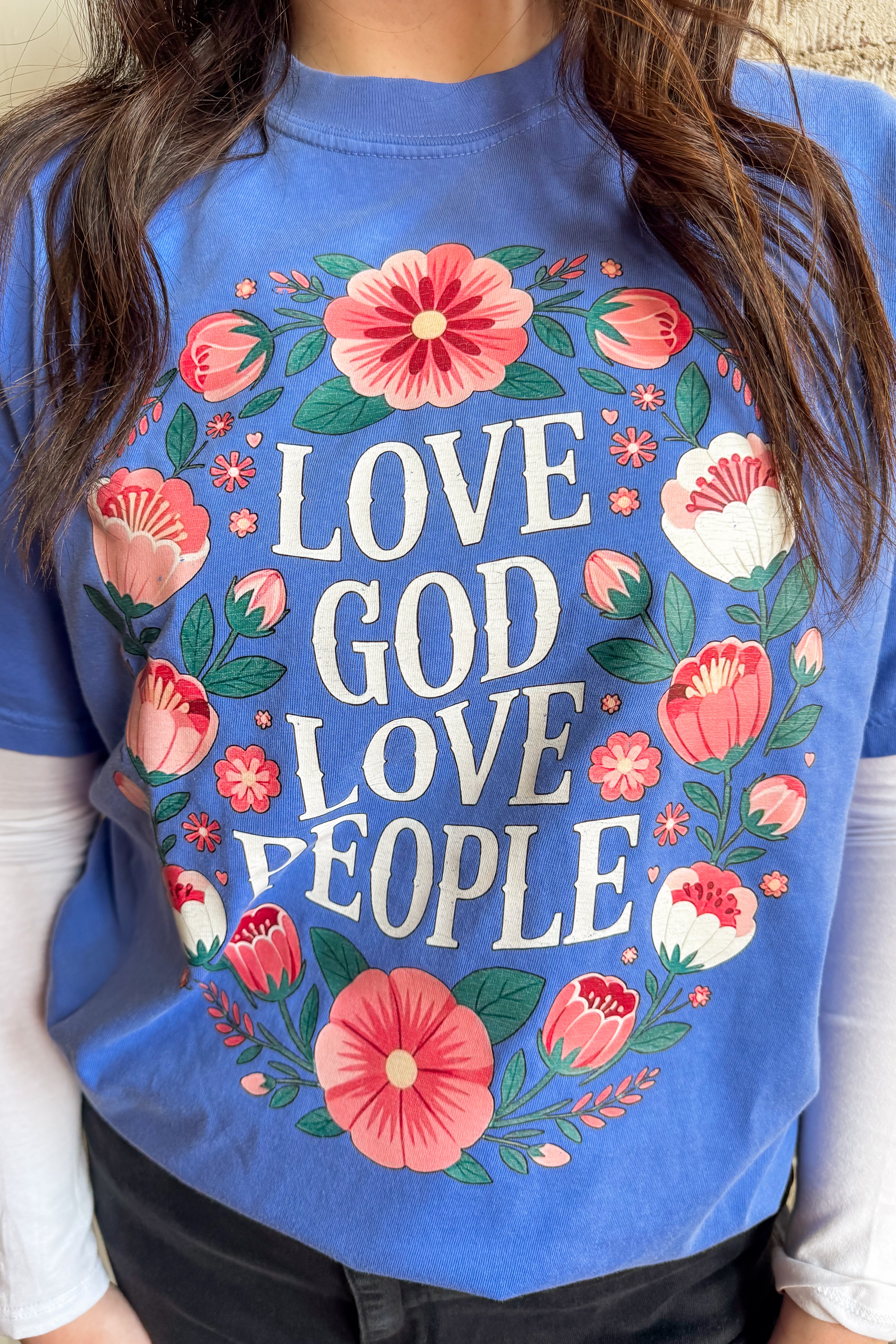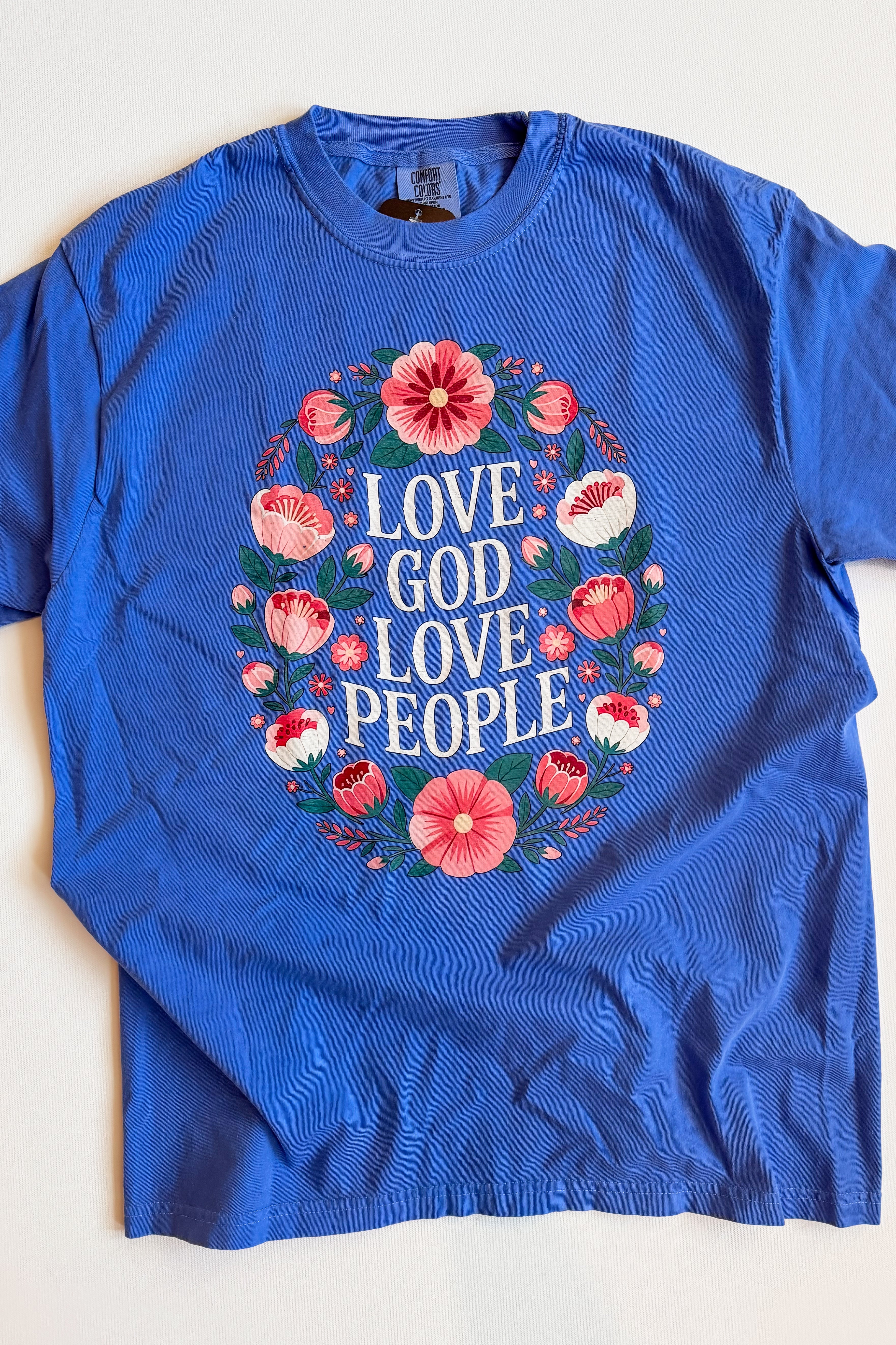 Love God, Love People! This faith based Christian tee is the perfect mix of florals and an encouraging message. This design was printed in house and applied to a Comfort Color tee, a fan favorite!