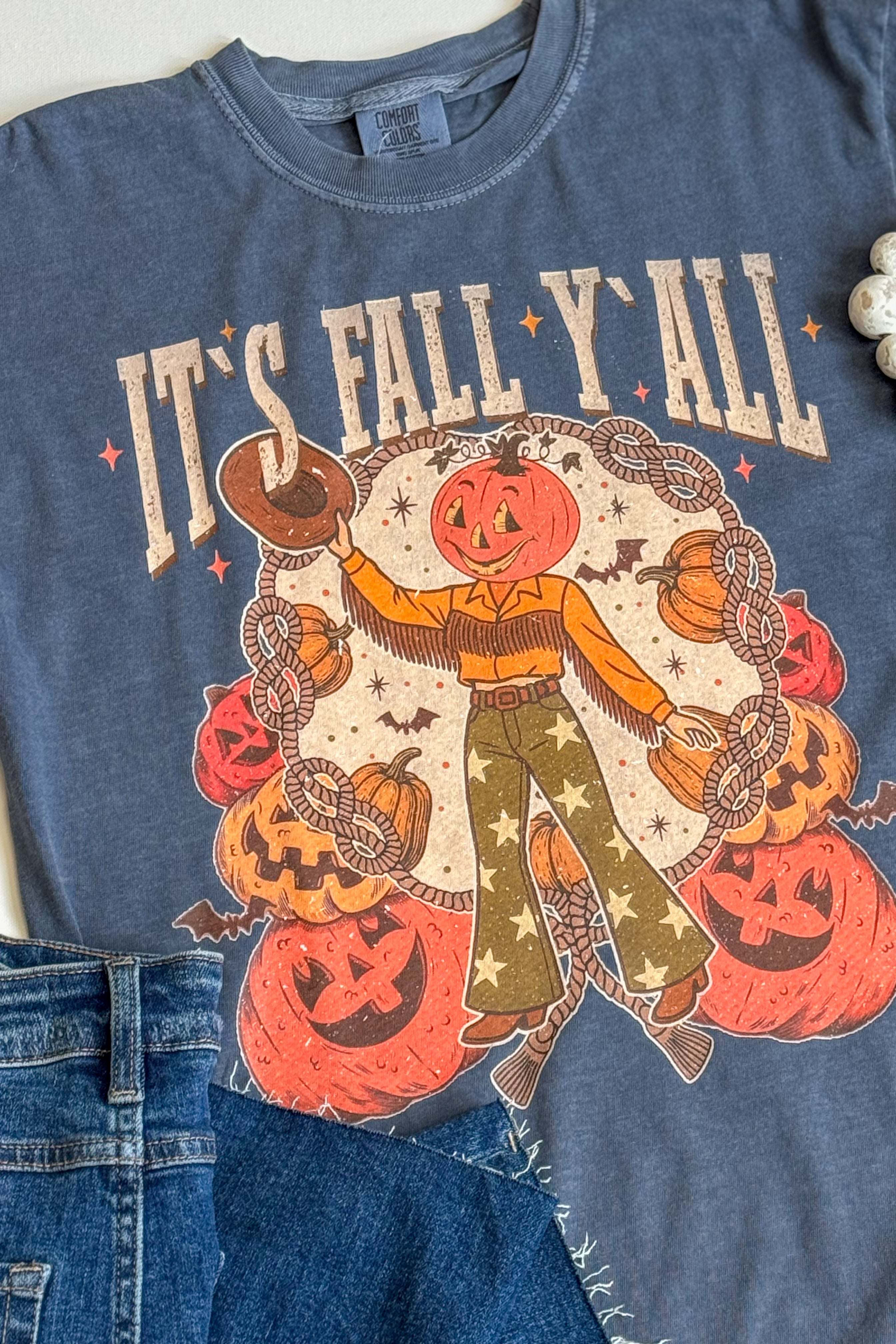 It's Fall Y'all! This pumpkin scarecrow tips its hat to the western girl in the cutest way. This tee is printed direct to garment on a comfort color tee.